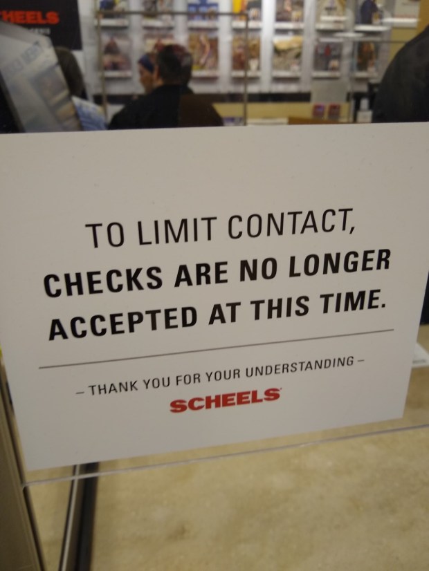 This sign was posted at Scheels in Lincoln, Nebraska. The sad thing is the number of people who will read it and never stop to think: Why does the virus live on checks, but not on cash?
